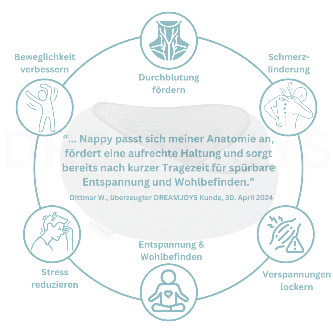 der Nutzer bestätigen, dass sich das Nappy Reisekissen perfekt anpasst und Verspannungen lindert.
